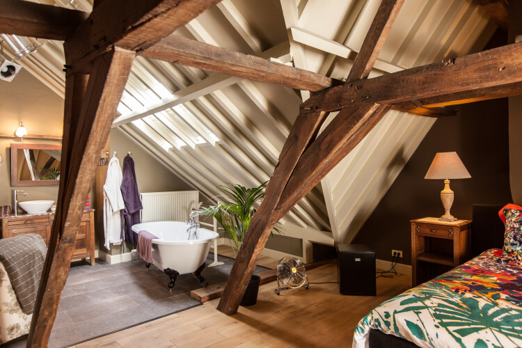 Luxueuze zolderverdieping van 40m2 op de 2e verdieping met veel lichtinval, eigen toilet, vrijstaand bad, lavabo, tweepersoonsbed, salon, televisie, frigo,...