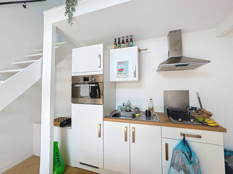 De kamer is volledig ingericht met meubels. Zo is er een bureau met bureaustoel, een eettafel met 2 stoelen, een bijzettafel, een bed (eigen matras te voorzien) met nachttafel, een kleerkast , salontafel met relaxstoel en een geïnstalleerde eigen keuken (koelkast, dampkap, microgolfoven, spoelbak en 2 kookplaten) - gemeenschappelijke douchekamer met toilet.