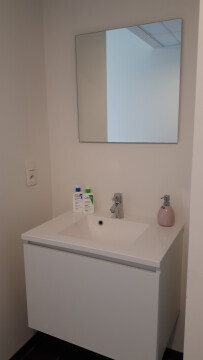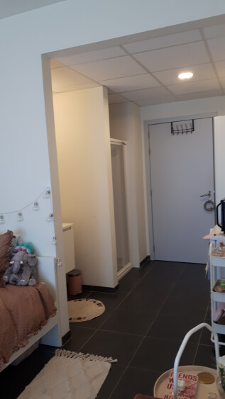 Studentenkamer op de tweede verdieping (= bovenste verdiep, lift aanwezig), gemeubileerd (1p bed met lattenbodem (zonder matras), kleerkast, bureau, wandboekenrekje), eigen douche en lavabo op de kamer. Gemeenschappelijke keuken, eet- en leefruimte, toiletten op de gang. Gemeenschappelijke (afgesloten) fietsenberging. De gemeenschappelijke ruimtes worden wekelijks gepoetst door de syndicus. Handig! Terras rondom rond de gemeenschappelijke ruimtes en de kamers, zalig om 's morgens met een koffie even buiten wakker te worden, of 's avonds met de kotgenoten samen buiten te zitten.