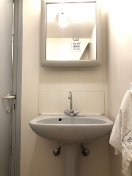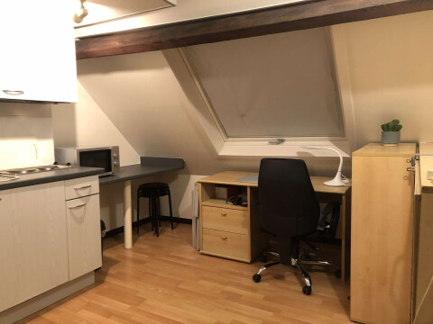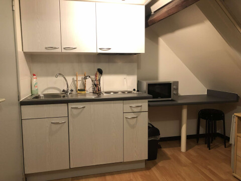 Faciliteiten: Het kot heeft een gelijkvloerse verdieping met een mezzanine. Bij binnenkomst beschik je over een eigen keuken, een apart toilet en een lavabo. De douche bevindt zich op de benedenverdieping van het gebouw.