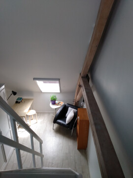 Grote lichtrijke kamer (25m2) + een eigen badkamer, gelegen naast de kamer. De keuken en tuin zijn gemeenschappelijk.
