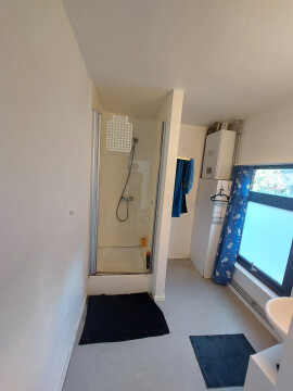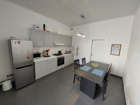 Gemeenschappelijke keuken, living en toilet op gelijkvloers en douche op 1° verdieping.