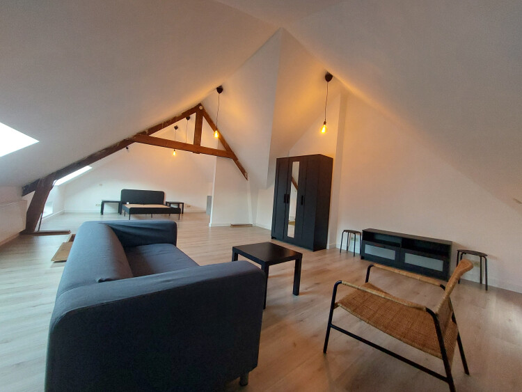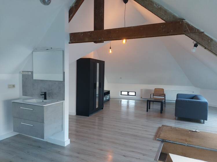 Ruime bemeubelde zolderkamer (incl dubbel bed, eigen lavabo en salon) op 2° verdieping van woning met 4 studentenkamers.