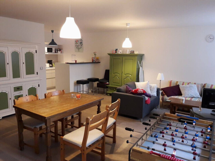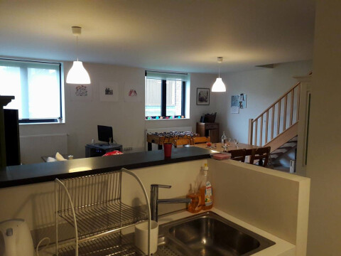 Ons appartement bestaat uit 2 verdiepingen, beneden is er een ruime living een keuken en een WC. Boven zijn de kamers en een badkamer.